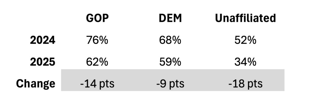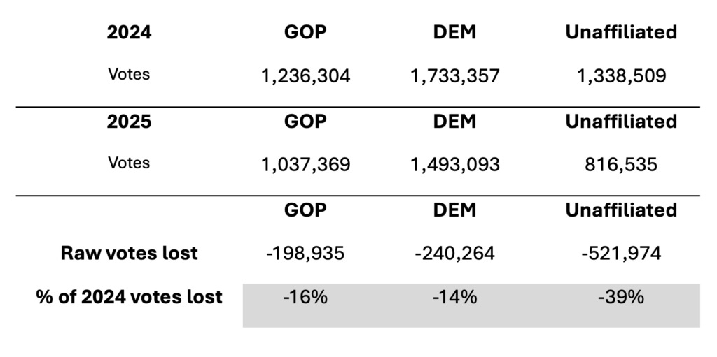 The data confirm that all groups saw a drop-off in turnout when comparing the 2024 presidential election to the 2025 election. One way to look for possible composition effects is to see if the parties lost voters evenly. Based on these data, that was not the case. Republicans lost a greater percentage of their 2024 voters (16%) than Democrats did (14%), and the number of unaffiliated voters declined by nearly 40% (see Fig. 1).